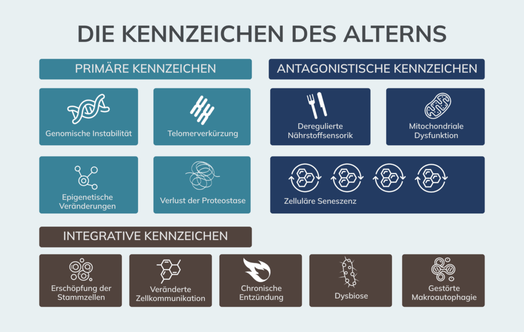 Mehr zu den ursprünglichen Kennzeichen findest du in unserem ausführlichen Leitfaden zu den Hallmarks of Ageing hier.