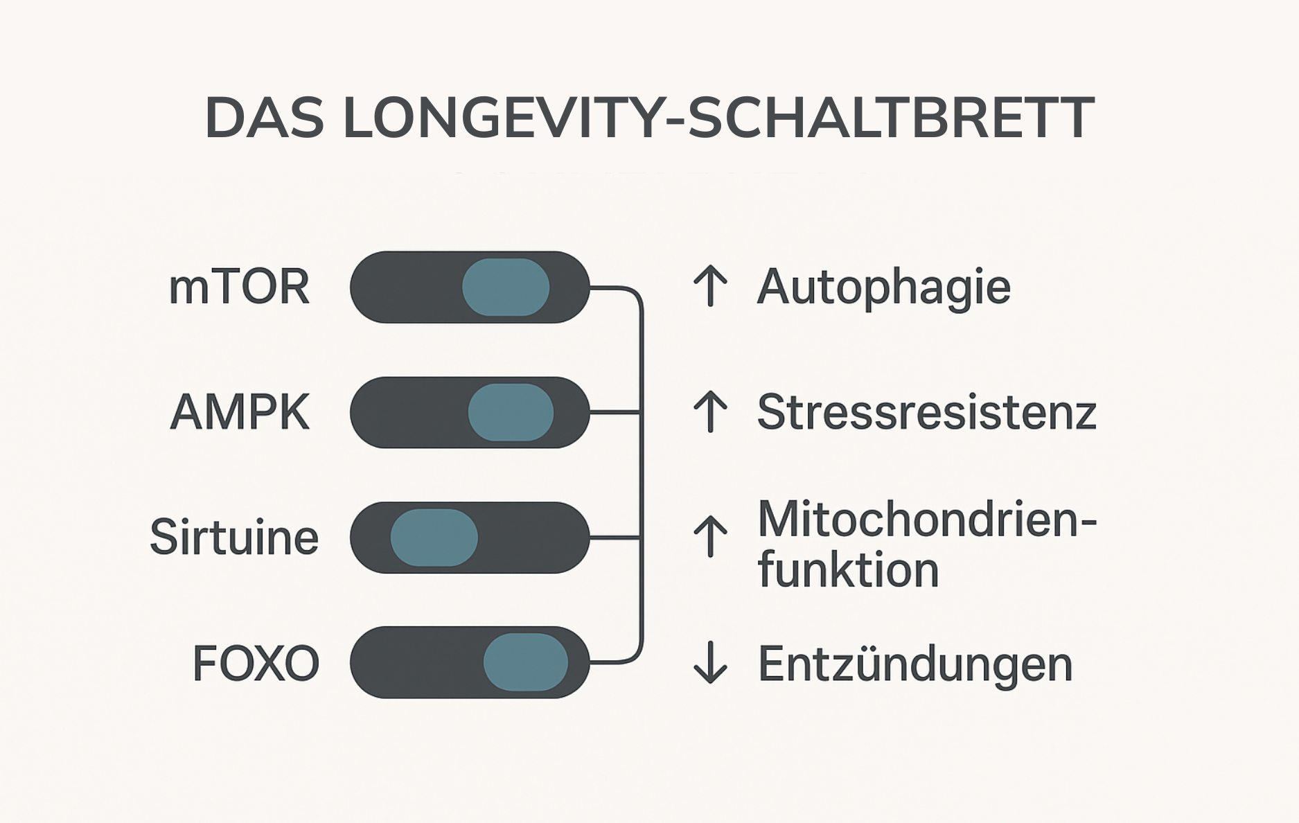 Gemeinsam bilden diese Longevity-Signalwege ein internes Kontrollsystem, das bestimmt, wie Zellen ihr Gleichgewicht aufrechterhalten, Schäden reparieren und auf Stress reagieren.