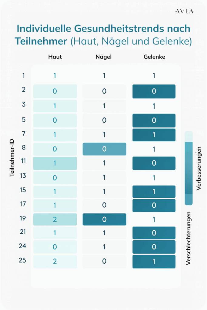 - 92 % berichteten über Verbesserungen in mindestens einem Bereich (Haut, Nägel, Gelenke)