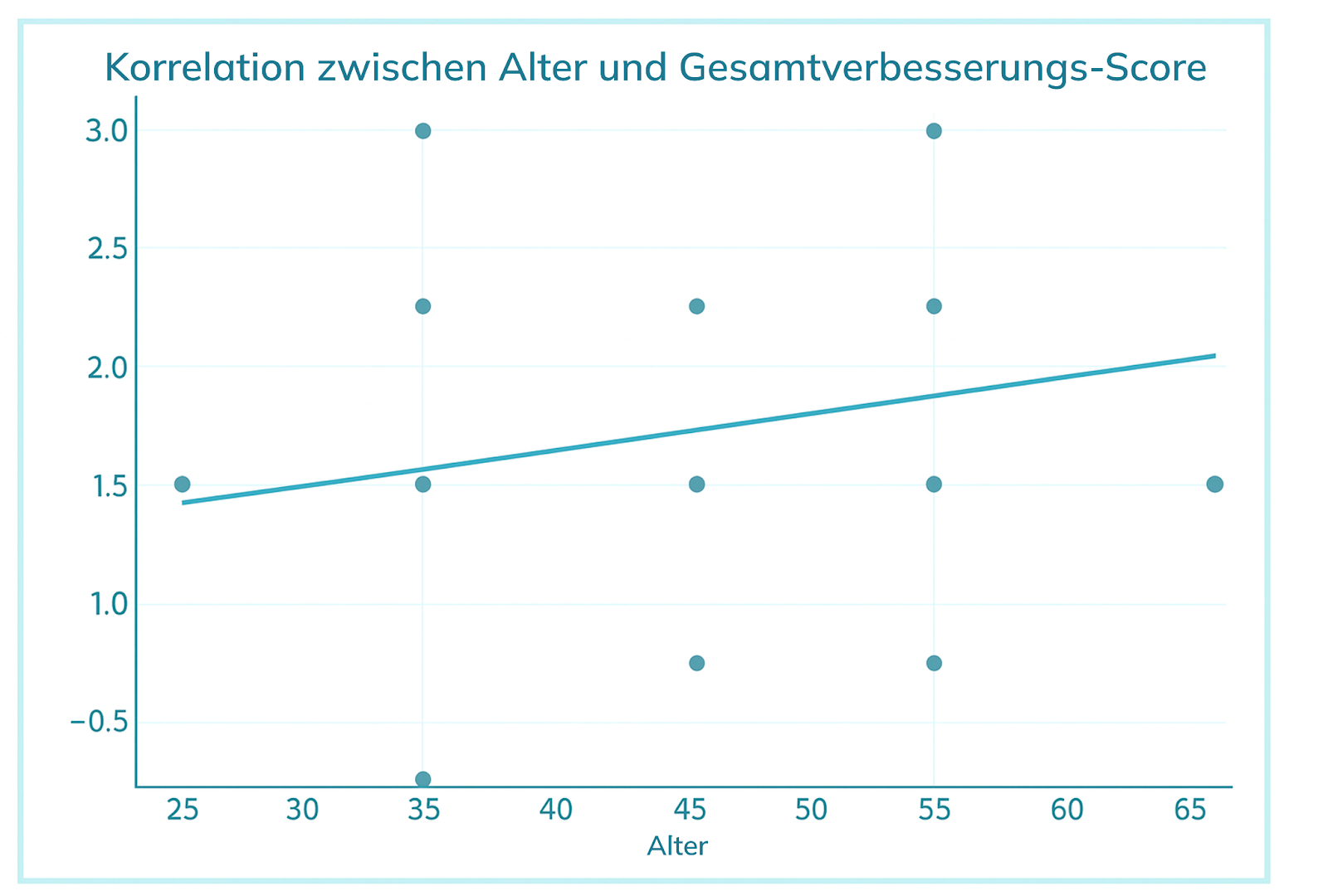 Zusätzlich deutet das zweite Diagramm (eine Korrelationsanalyse) darauf hin, dass ältere Teilnehmer*innen tendenziell mehr Gesamtvorteile wahrnahmen – was darauf hinweist, dass das Alter möglicherweise die wahrgenommene Wirksamkeit des Produkts beeinflusst.