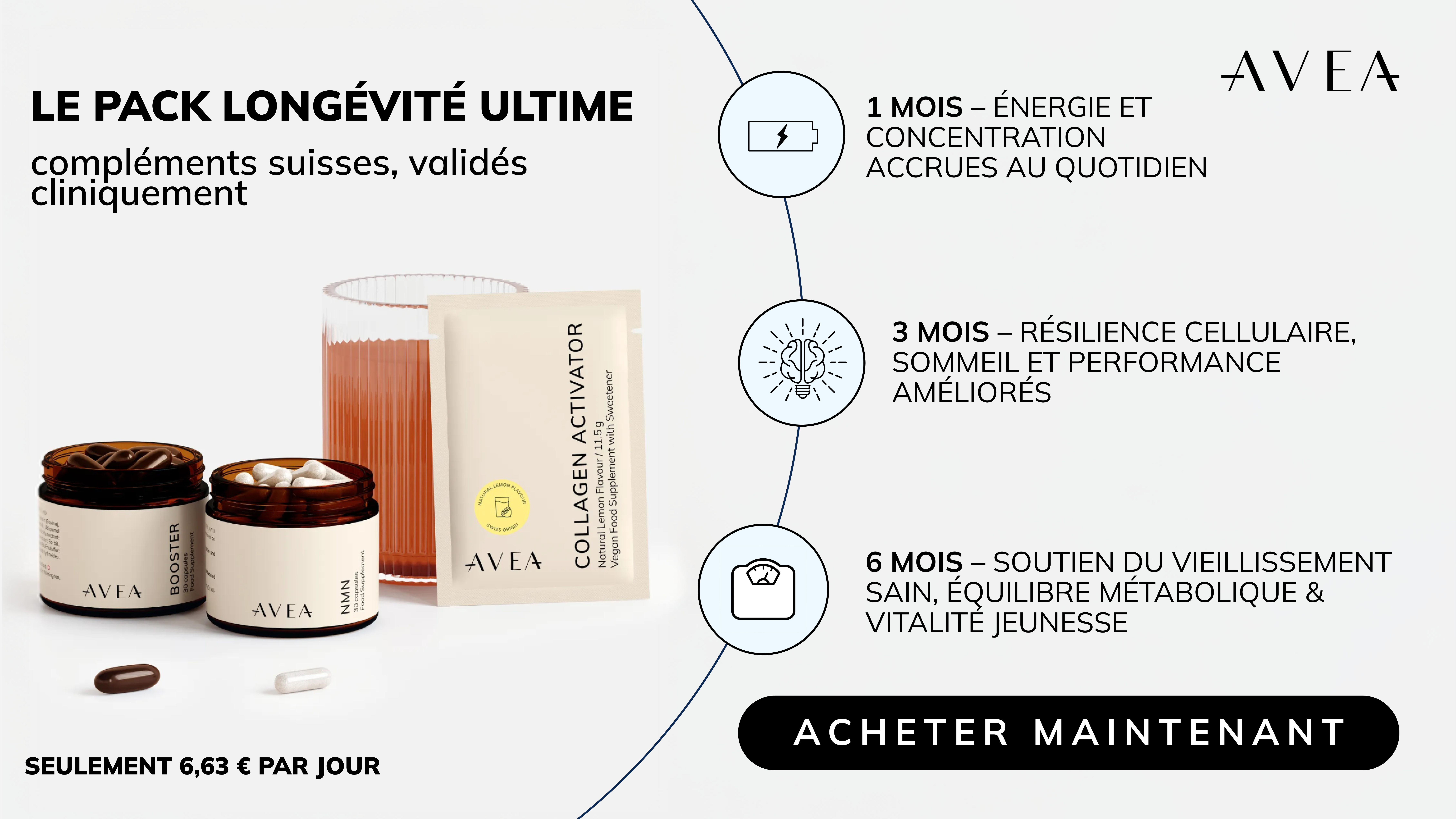 C’est pourquoi le Longevity Bundle d’AVEA a été conçu comme un système complet et synergique, formulé par les scientifiques de l’ETH Zurich pour aider votre corps à mieux vieillir de l’intérieur. Il combine trois compléments alimentaires complémentaires — NMN, Booster et Collagen Activator — chacun traitant un aspect spécifique de la vitalité cellulaire.