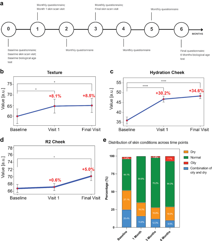 At time point 0, i.e., baseline, participants completed a questionnaire, a skin scan of the cheek, forearm, and upper arm via Visia scan and Cutometer and Corneometer analysis at Hautwek Clinic in Zurich, and provided saliva for an epigenetic age test (Fig. 2 and Fig. 3a). Participants filled out the questionnaire every month, and during months one and three, they visited Hautwerk Zurich for skin analysis. Participants completed the questionnaire at month six and provided a saliva sample to estimate their biological age (Fig. 3a).