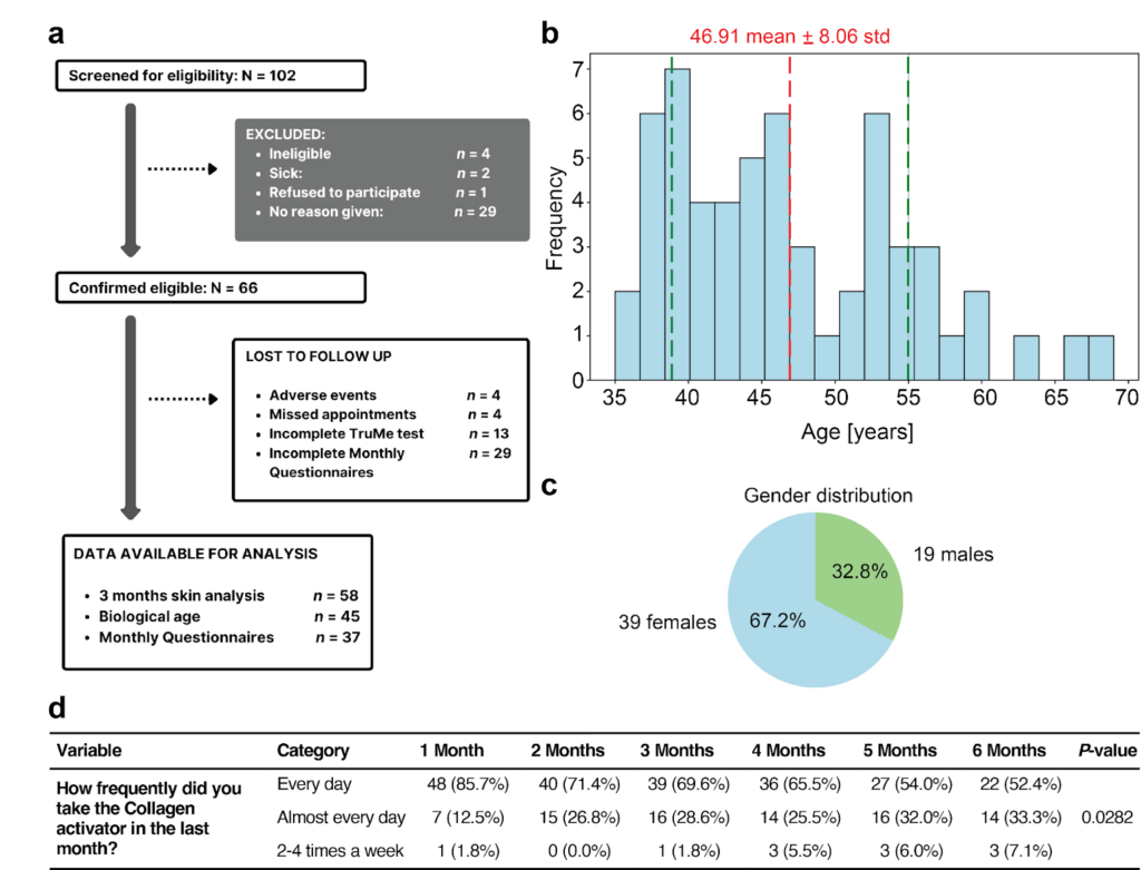 We screened 102 participants and confirmed that 66 participants were eligible for the study (Fig. 1a). The dropout rate due to adverse events was 6%, with four out of 66 participants experiencing mild, transient side effects that resolved without intervention (Fig. 1a). In particular, three participants reported rosacea, including facial redness and mild skin rash; one experienced adverse intestinal reactions. All four participants who dropped out experienced these adverse effects after two to three months of Collagen Activator intake, suggesting a low likelihood of an acute effect of Collagen Activator towards these events and, in general, that the Collagen Activator was safe and well-tolerated. Of the 66 participants confirmed as eligible, 37 completed the monthly questionnaires. After three months, 58 participants underwent the three skin analyses, and 45 completed the biological age test at six months (Fig. 1a)13. The 58 participants were spread across a range of 35–68 years of age. The mean age of participants was 46.91 years ± 8.06 (95% CI: 44.80–46.48) (Fig. 1b). The cohort consisted of 39 females (67.2%) and 19 males (32.8%) (Fig. 1c). The demographic and baseline characteristics of the participants were assessed using the questionnaire. The mean body mass index (BMI) was 22.28 kg/m2, with a standard deviation of 2.79 kg/m2, indicating a relatively homogeneous distribution of BMI values across the cohort (Table 2). The majority of participants (88%) were White/Caucasians (Table 2). Furthermore, 83 % of participants hold a university degree, 69% never smoked, and only 4 participants occasionally smoked, the rest all quit smoking, one-third did not drink any alcohol, and two-thirds reported either 1-2 or 3-4 drinks per week, 66% reported taking supplements, almost half of the participants exercise 3-4 times a week with 88% moderate to lightly intensity and only 2 participants reported to be sedentary (Table 2). Regarding the adherence of Collagen activator consumption. 86% of participants reported daily Collagen activator intake in the first month, which decreased to 52% at month six (P = 0.028, Fig. 1d). Taken together, our cohort with a mean age in the mid-forties is young, given that this is the start of age-related phenotypes in humans. Furthermore, our cohort is exceptionally well-educated and has healthy lifestyles.