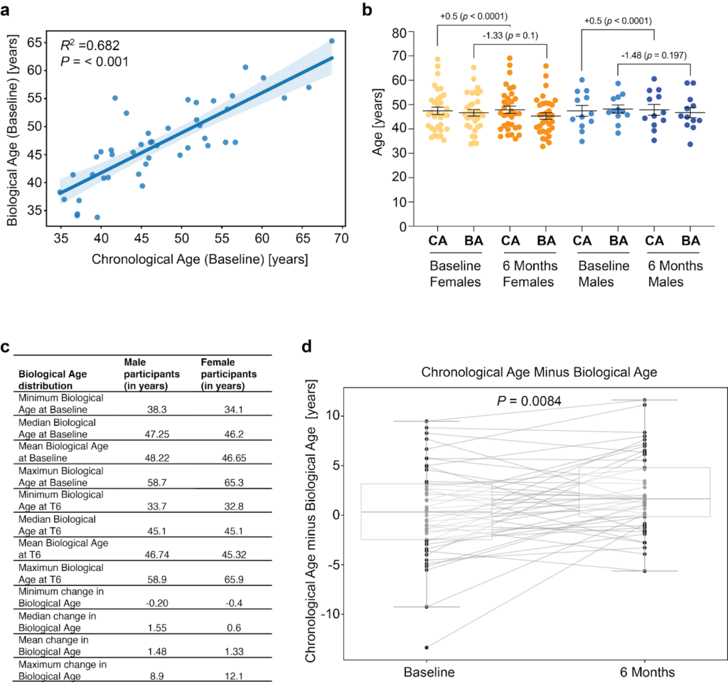 At six months, 45 participants (33 females, 12 males) completed the saliva epigenetic test to compare to the beginning (time point 0) before taking the Collagen Activator (Fig. 4a). At baseline, the mean chronological age with a standard deviation of 47.46 ± 8.33 was comparable to the mean biological age of 47.07 ± 7.21 years (mean difference = -0.39 years, 95% CI -1.80 to 1.03; P = 0.58), indicating that the participants, on average, were slightly but not statistically significant younger than expected at baseline. The linear regression coefficient was 0.715 (95% CI: 0.565-0.865, P < 0.001), displaying an adjusted R-squared of 0.682. The Pearson correlation was 0.826 (p<0.001) (95% CI: 0.703-0.901) (Fig. 4a).