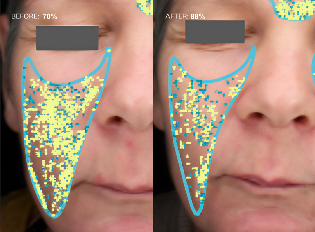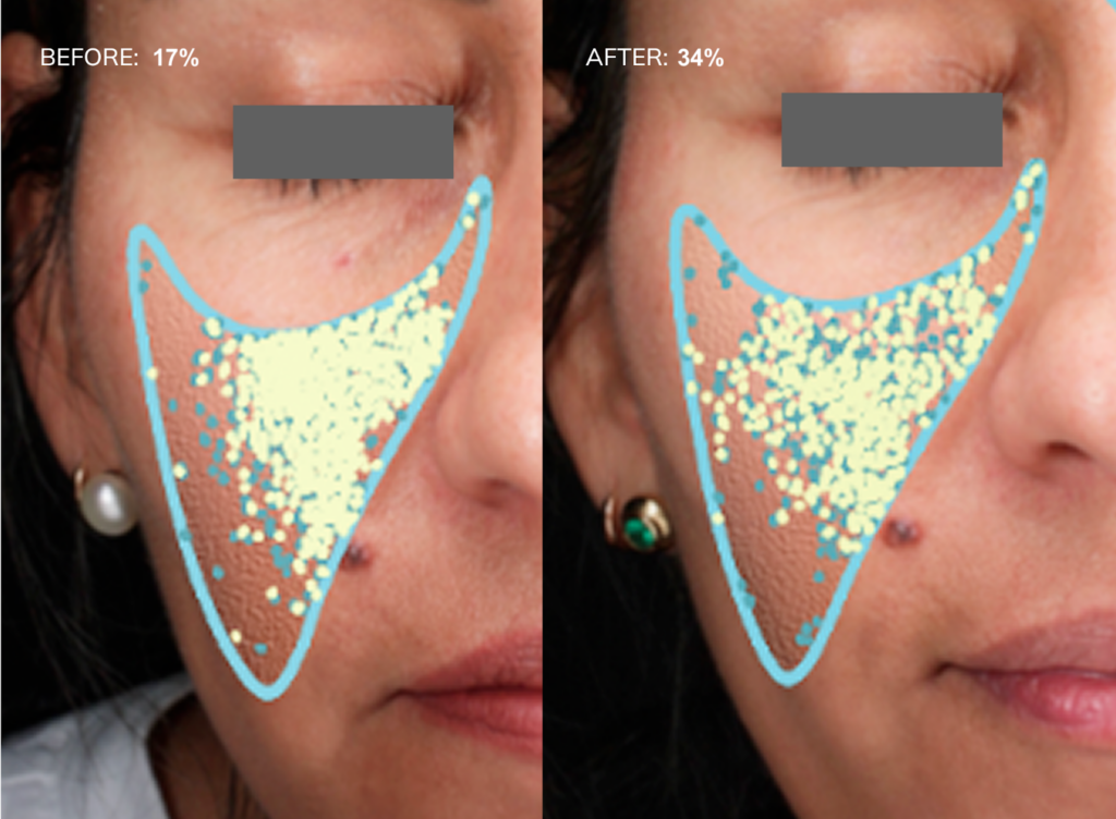 A representative image of the Visia analysis is shown in Figure 2, where a lower percentage indicates a less favourable skin condition, while a higher percentage reflects an improvement. In this case, the observed change from 39% to 80% signifies an improvement in skin texture – a 100% improvement – highlighting the visible efficacy of the intervention over the test period. This enhancement is also visibly evident through the reduced number of yellow dots after 30 days.